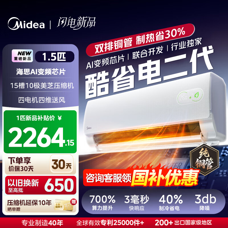 美的(Midea)空调大1.5匹挂机酷省电二代Pro新一级能效变频节能冷暖两用壁挂式卧室空调防直吹低噪WiFi智控补贴 酷省电二代 Pro 大1.5匹 双排铜管 海思AI芯片