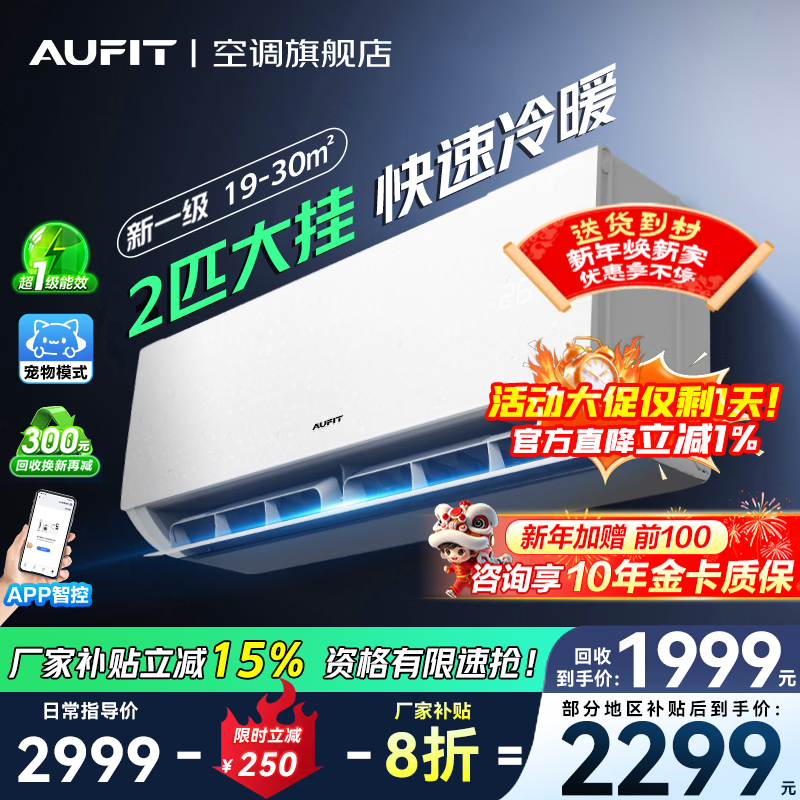 AUFIT空调奥克斯(AUX)出品2匹大挂机新一级能效变频冷暖家用卧室壁挂式防直吹除菌自清洁补贴20%空调 2匹 一级能效 双排铜管+wifi智控(可延迟发货)