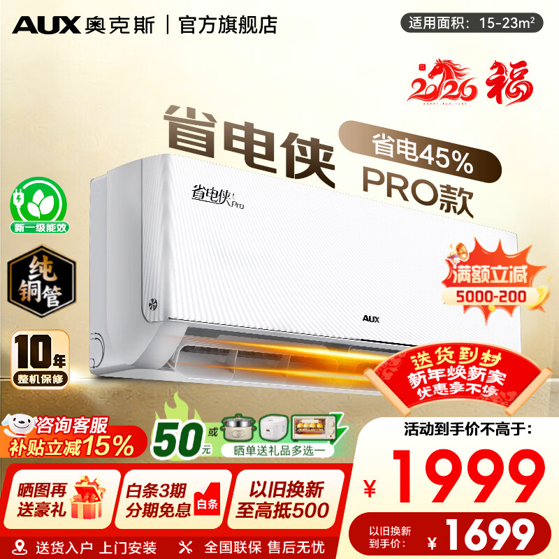 奥克斯(AUX)空调大1匹挂机省电侠pro家用冷暖新一级能效省电节能家电升级挂机挂机空调卧室壁挂式厂家补贴15% 省电侠Pro 大1匹 新一级能效变频