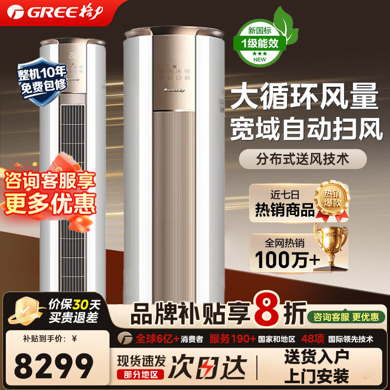 格力(GREE)空调柜机冷静王+大3匹柜机新一级能效客厅家用立柜式变频冷暖【线下爆款】分布式送风冷等离子杀菌 大3匹 一级能效冷静王 金秋白