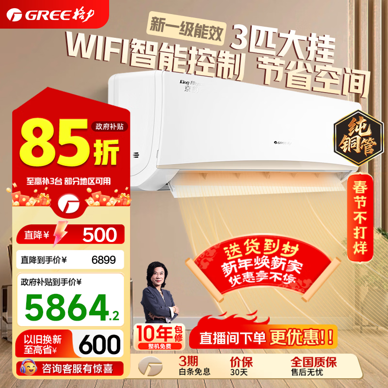 格力(GREE)空调京韵 新一级/三级能效变频冷暖 大风量 高温自洁 WIFI小客厅大卧室壁挂式大挂机 家电补贴 3匹 一级能效京韵