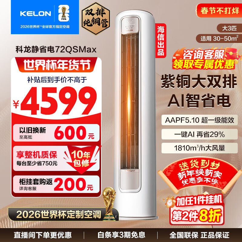 科龙(KELON)海信出品 静省电Max 大3匹柜机 新一级能效 变频速冷热 防直吹 家用客餐厅立柜式空调 以旧换新 大3匹 一级能效 顶配72QSMAX【10年整机包修】