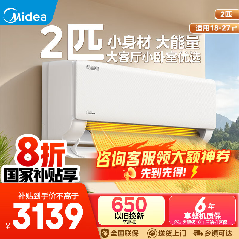 美的(Midea)空调2匹挂机 酷省电 新一级能效 卧室壁挂家用独立除湿节能省电智能家电以旧换新 2匹 一级能效【两匹挂机】省电28%