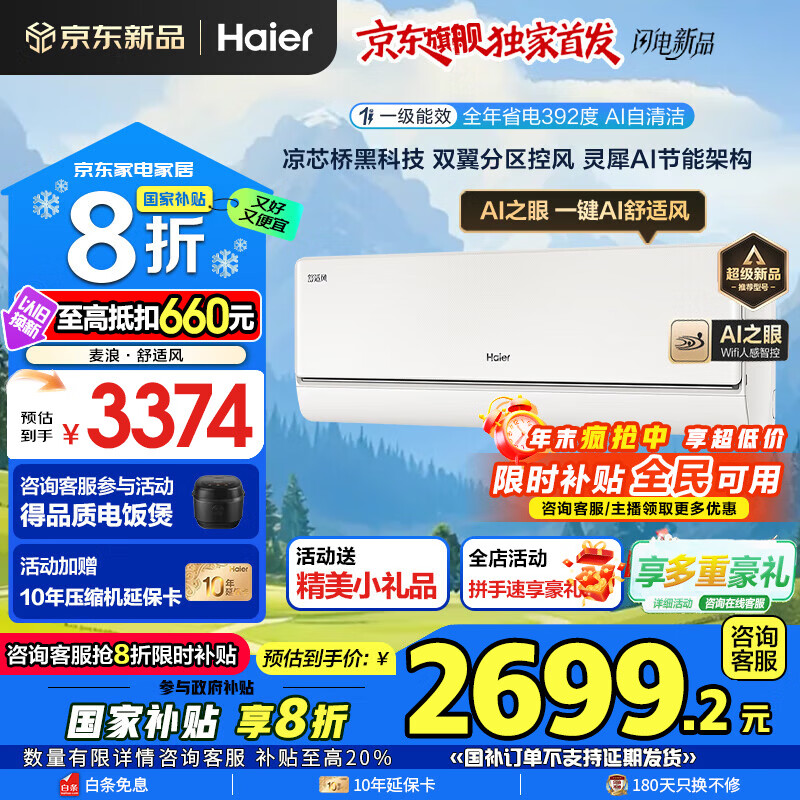 海尔空调麦浪舒适风1.5匹大1P强劲冷暖新一级能效节能变频家用挂机壁挂式双翼控风 AI之眼省电除菌除湿 1.5匹 一级能效舒适风+双翼分区控风+AI之眼