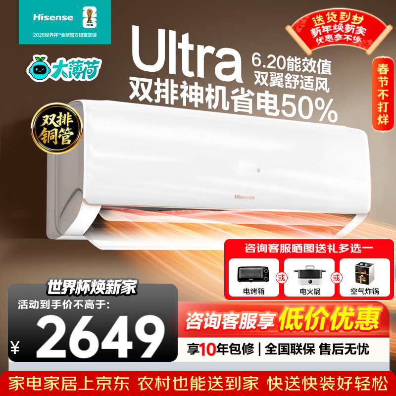 海信(Hisense)大薄荷智省电Ultra 世界杯定制空调 大1.5匹双排铜管 AI省电50% 双翼定制风KFR-35GW/A330UPro-X1 舒适好睡眠 大1.5匹 一级能效