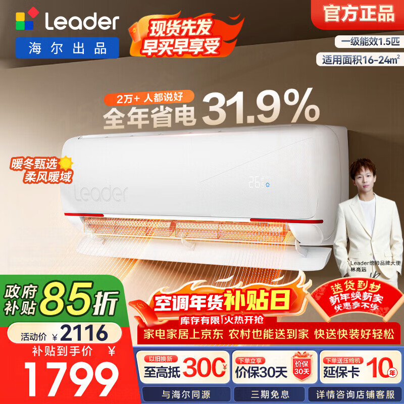 海尔(Haier)智家出品 统帅空调超省电1.5匹挂机 新一级能效变频冷暖大风量自清洁 元气系列 换新补贴以旧换新 元气 1.5匹 挂机一级能效超省电35LKG