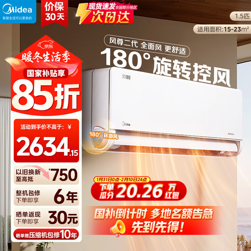 美的(Midea)空调 1.5匹风尊二代 新一代舒适空调 一级能效变频冷暖 壁挂式挂机智能家电云朵系列 国家补贴 1.5匹 一级能效风尊二代 全国联保 配送