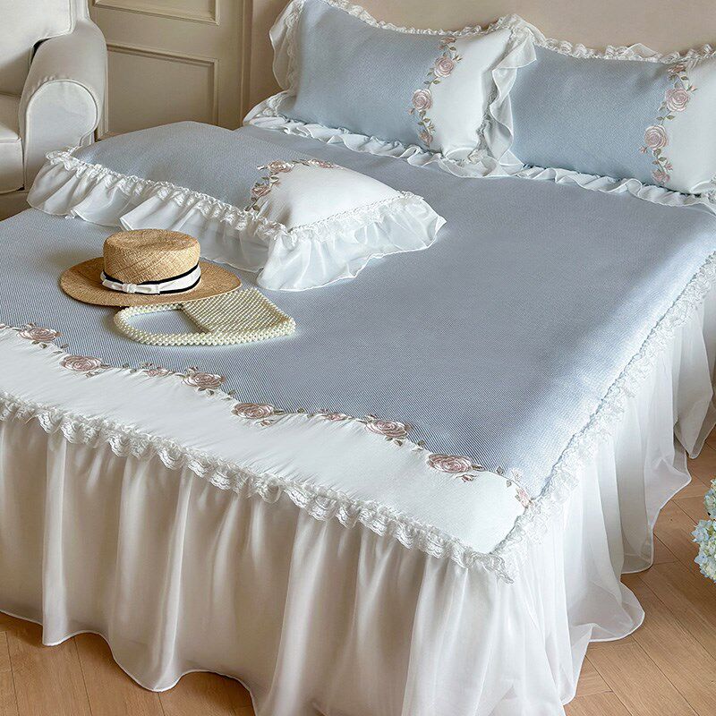 高端玫瑰提花冰丝凉席三件套床裙款夏季可机水洗公主风空调软席子
