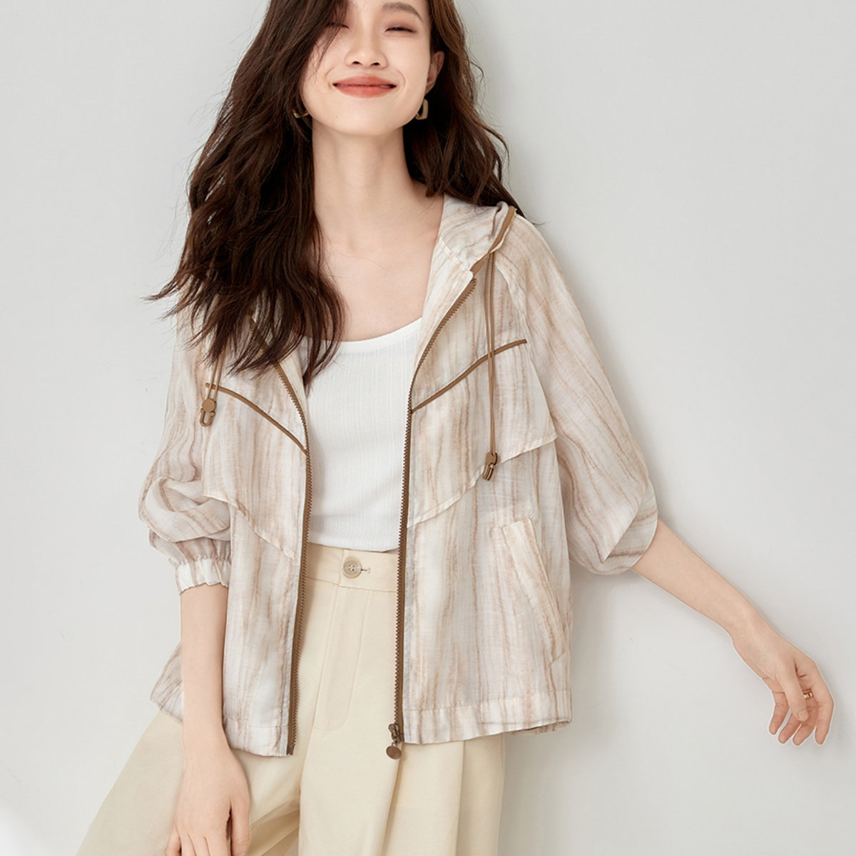 冰丝修身防晒衣女空调服收腰纯欲风拉链开衫轻薄春秋短外套连帽