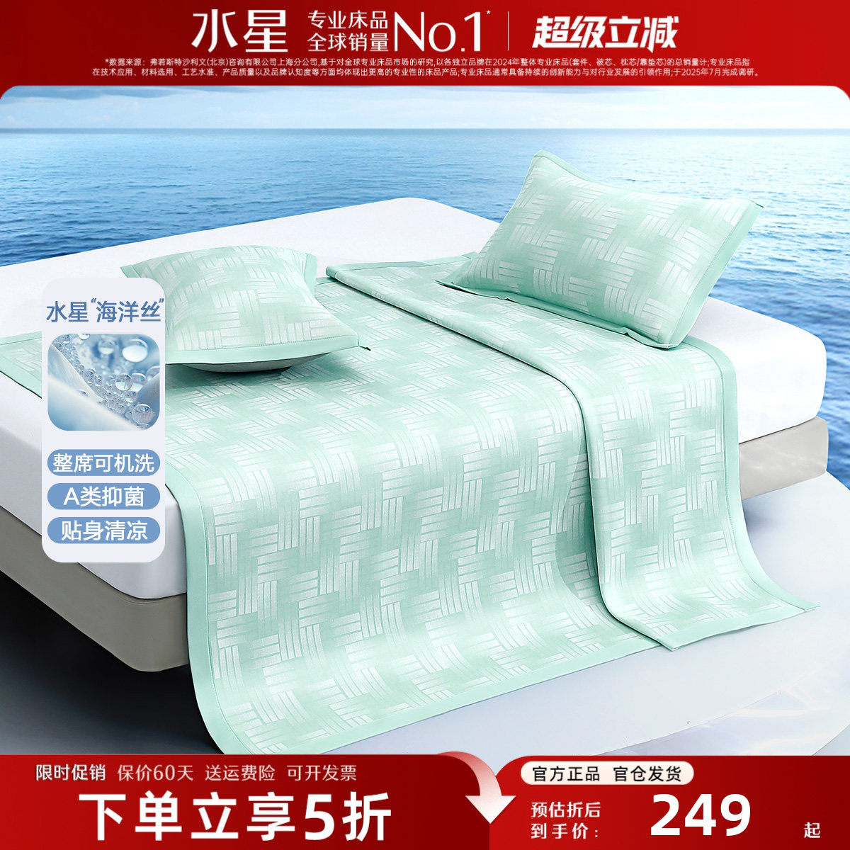 水星家纺A类抑菌冰丝席两件/三件套可机洗凉感席夏季凉席空调席子