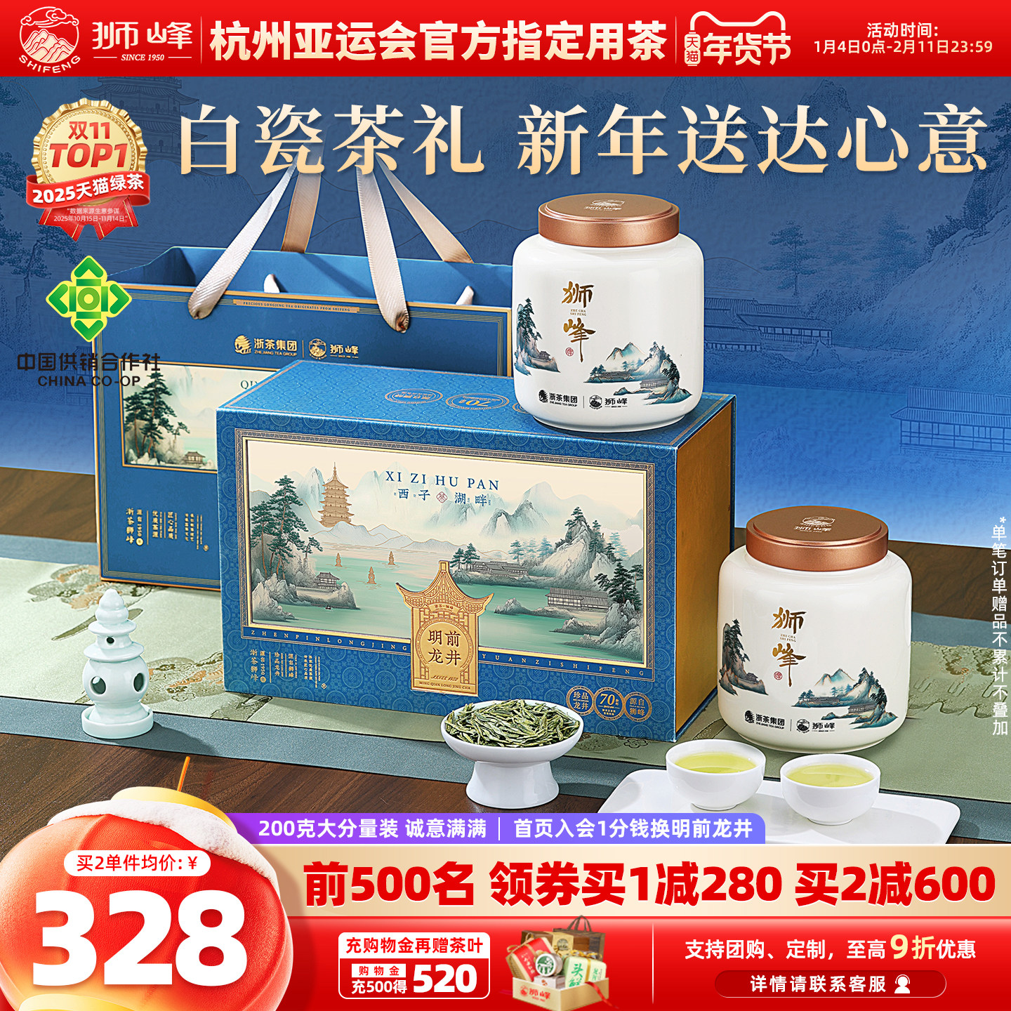狮峰牌茶叶礼盒装明前龙井茶特级200g白瓷送礼长辈绿茶官方旗舰店