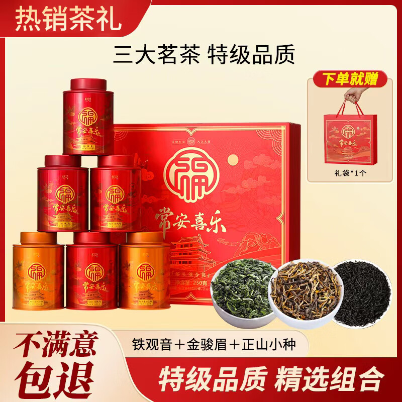 杭颂 茶叶礼盒 金骏眉正山小种红茶 安溪铁观音乌龙茶 组合装送礼250g 【常安喜乐】三大茗茶250g*1盒