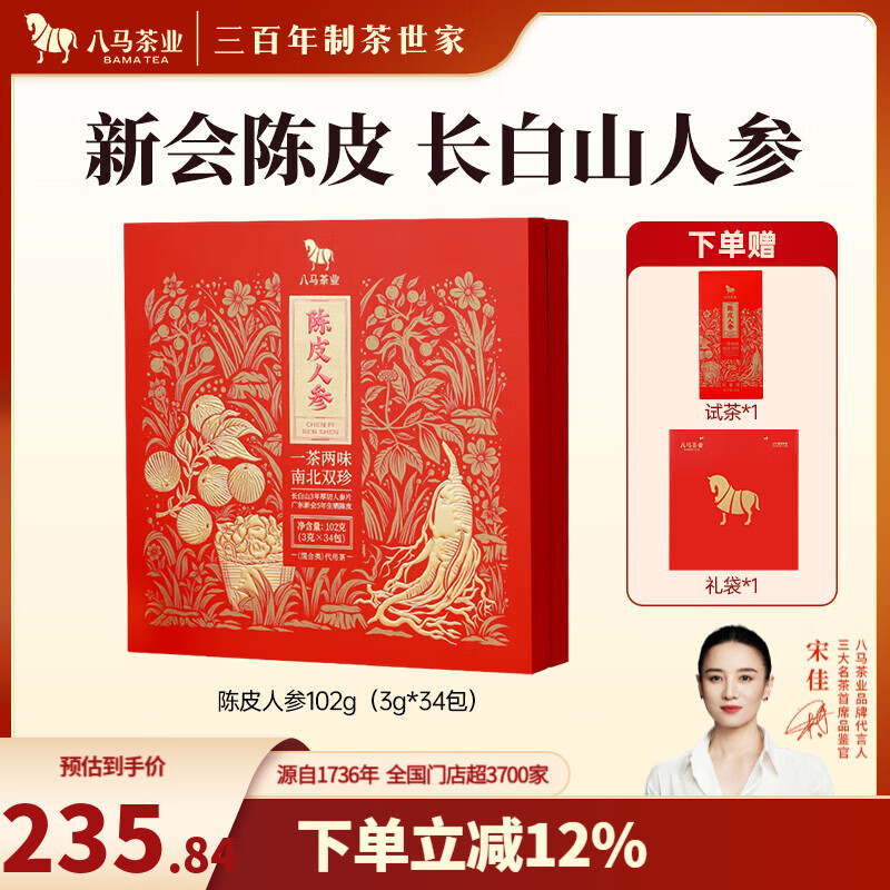 八马茶业 陈皮人参茶 广东新会陈皮 吉林长白山人参 送礼茶叶 礼盒装 102g【赠试茶+礼袋】