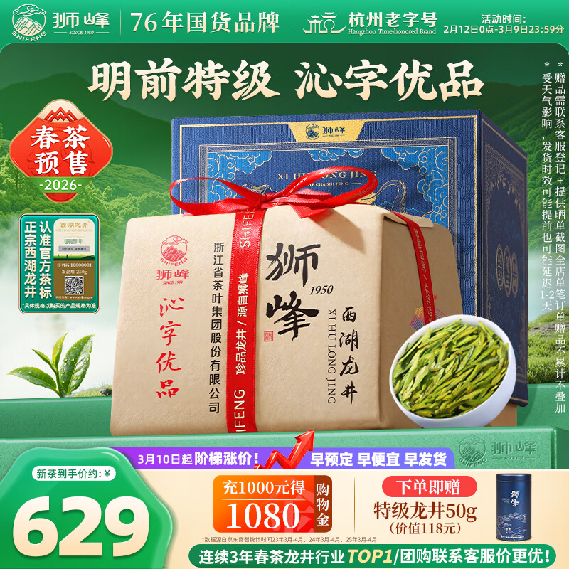 狮峰牌2026年新茶预售绿茶西湖龙井茶叶明前特级250g纸包礼盒装送长辈