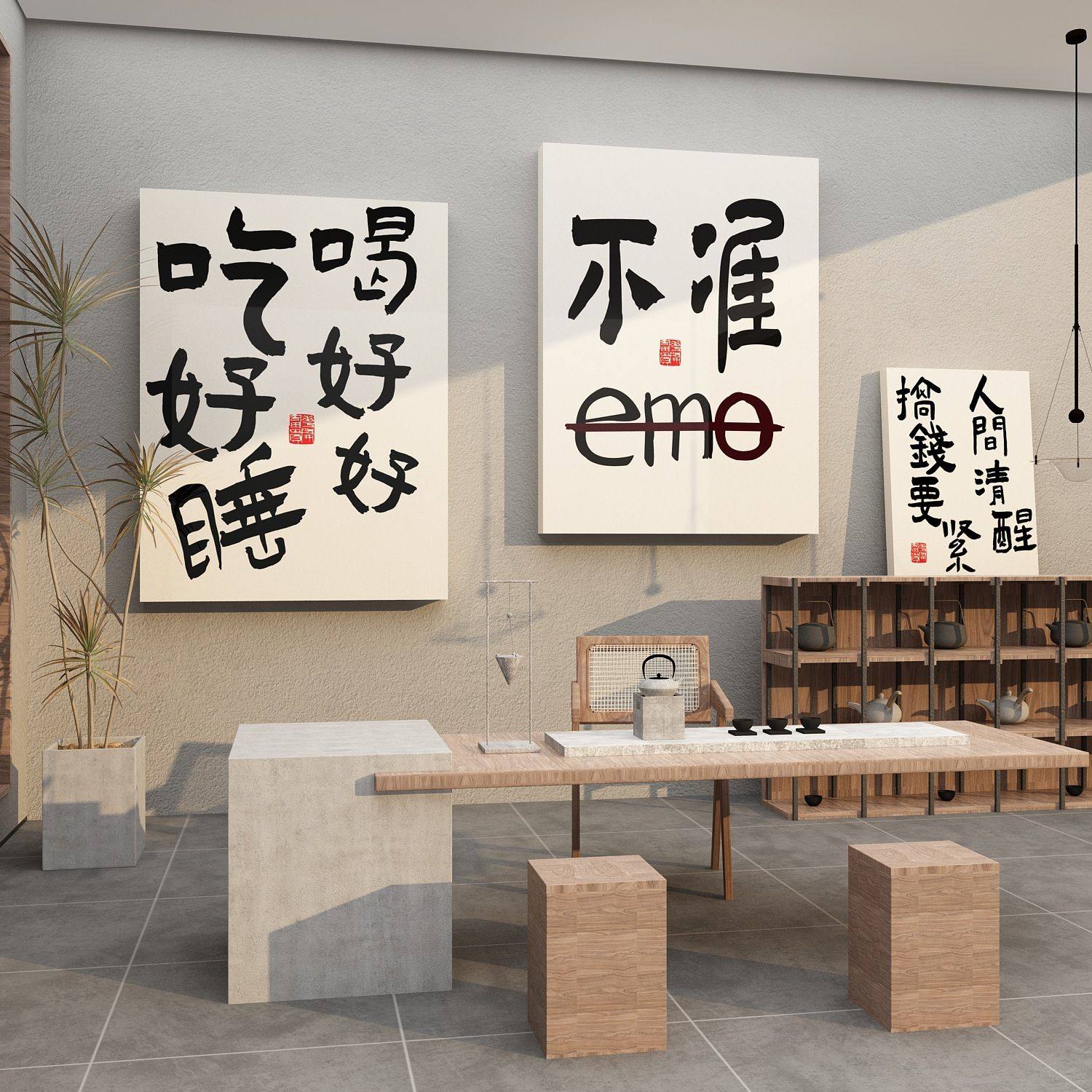 绿茶叶店室布置背景墙面装饰网红氛围高级感画馆文化房间效果图贴