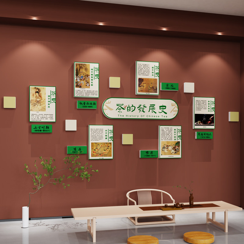 绿茶叶店室布置背景墙面装饰网红氛围高级感画馆文化房间效果图贴