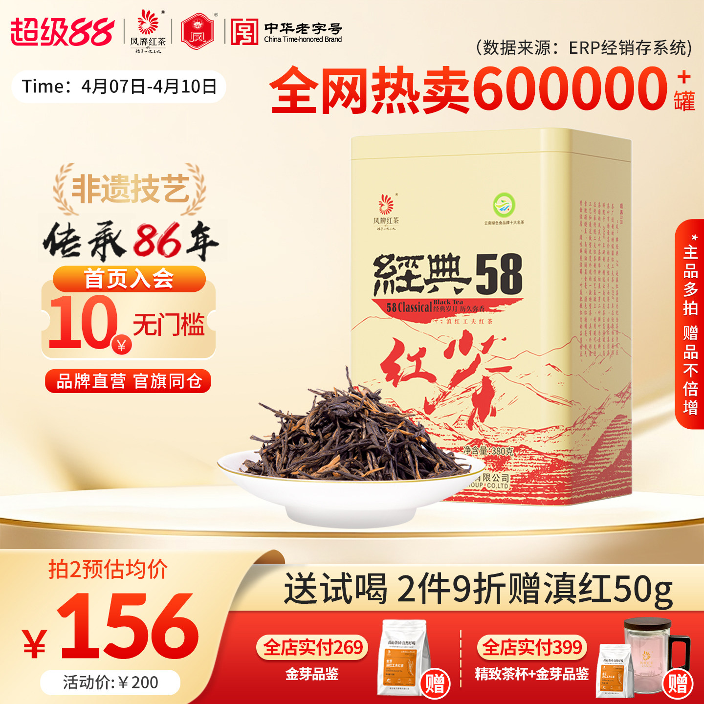 凤牌红茶滇红经典58官方正宗云南凤庆茶叶特级浓香380g口粮散装