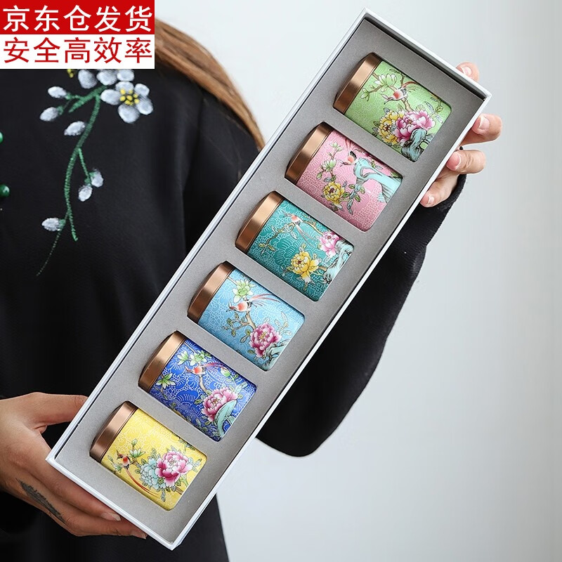 古德窑 六个装珐琅彩茶叶罐陶瓷迷你茶盒金属盖密封罐便携随手茶罐 珐琅彩六色6个茶罐礼盒装 20克 6个