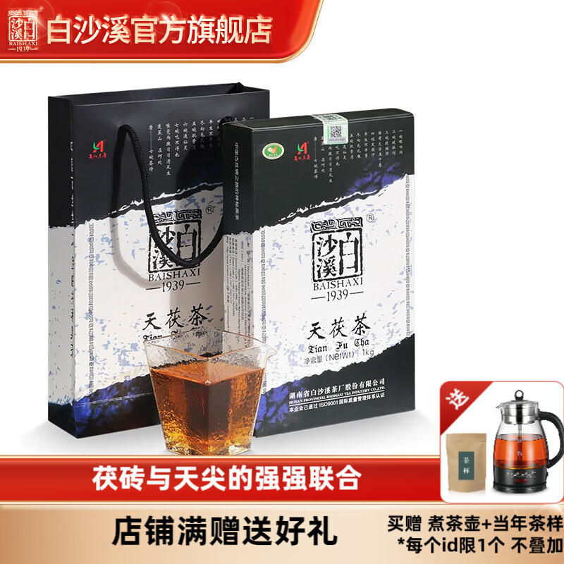 白沙溪金奖湖南安化黑茶天茯茶1kg金花茯砖茶叶一级天尖精料手工精筑 当年茶赠煮茶壶