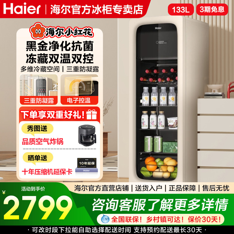 海尔小红花套系133升元气冰吧小型冷藏保鲜家用茶叶饮料展示柜