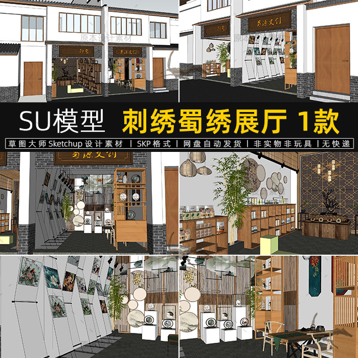 刺绣蜀绣展厅SU模型中式展示空间茶叶店门头店铺画卷草图大师