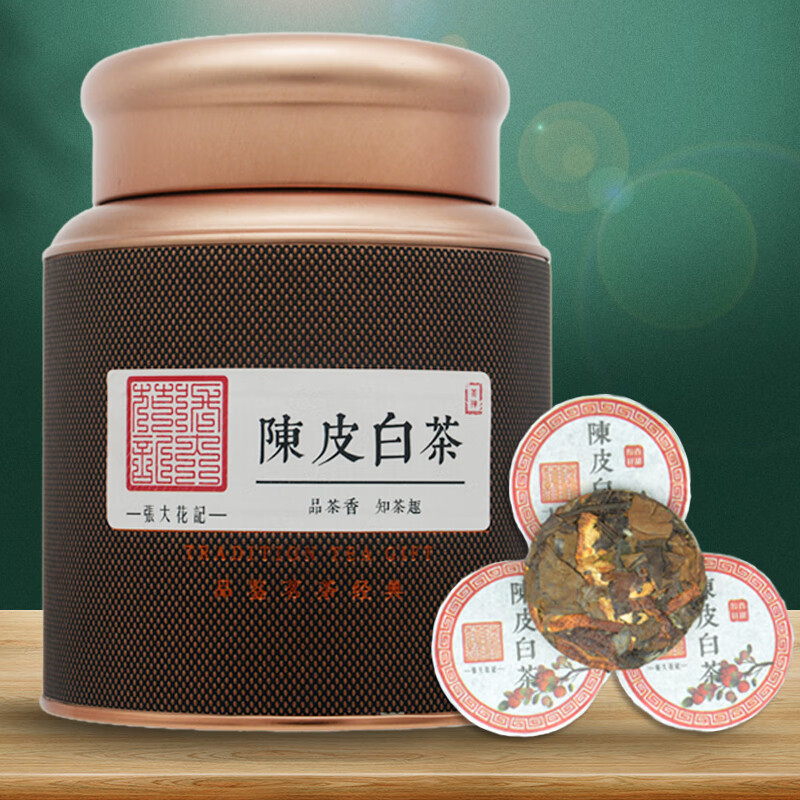 張大花記 茶叶 陈皮白茶 陈皮与白茶压紧小圆饼 一饼一泡 精美罐装 黑罐陈皮白茶-2罐500克