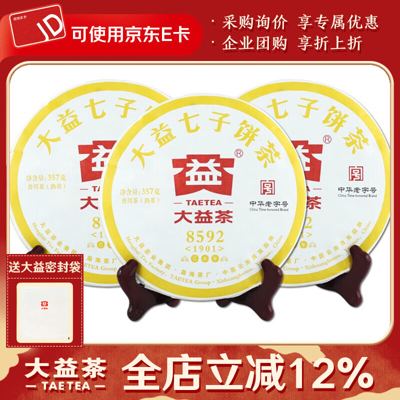 大益茶叶 普洱茶 茶叶 熟茶 普洱茶8592 随机批次发货 2019年【3饼装】357克