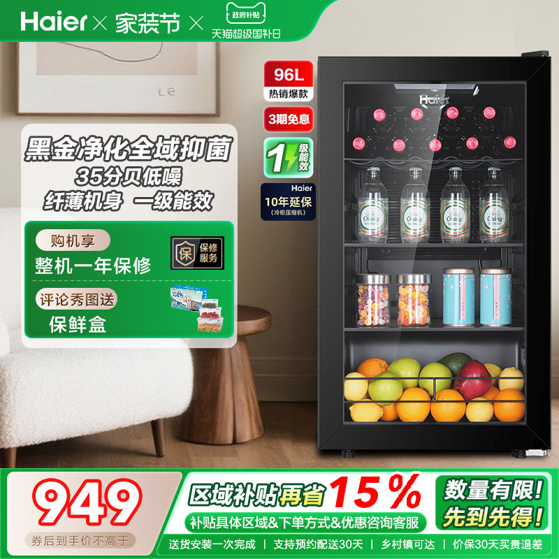 海尔96升冰吧家用客厅茶叶饮料柜办公室保鲜柜时尚冷藏小冰箱