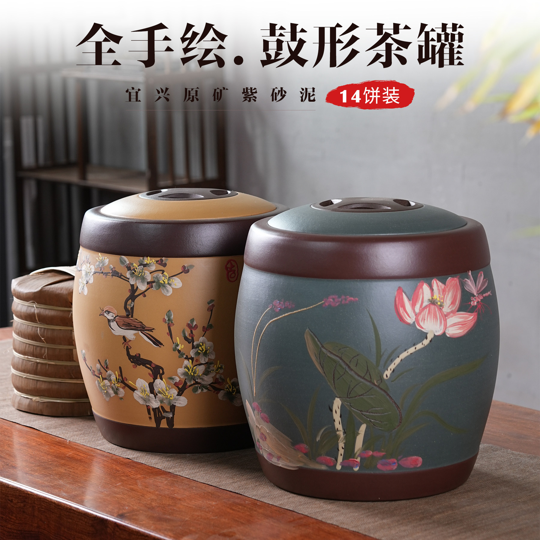 14饼圆鼓形彩绘茶叶罐中号紫砂存茶罐普洱茶储存罐防潮中式茶缸