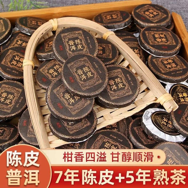 陈皮普洱茶小沱茶饼云南陈皮熟茶叶黑茶小玉饼陈年柑普茶500g