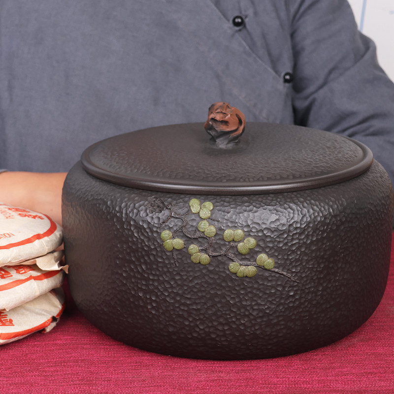三饼缸 建水紫陶茶叶罐茶缸白茶饼黑茶普洱茶锤纹堆塑陶瓷密封罐