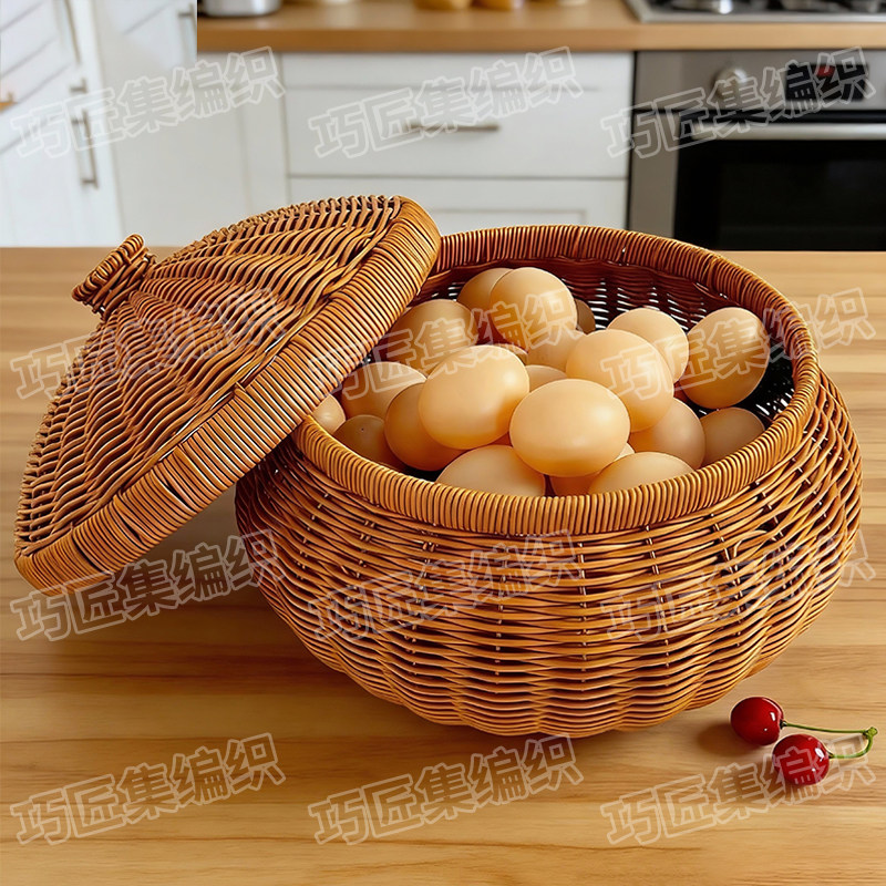 手工藤编织收纳筐带盖高腰鸡蛋果筐家用零食馒头干货茶叶篮储物罐