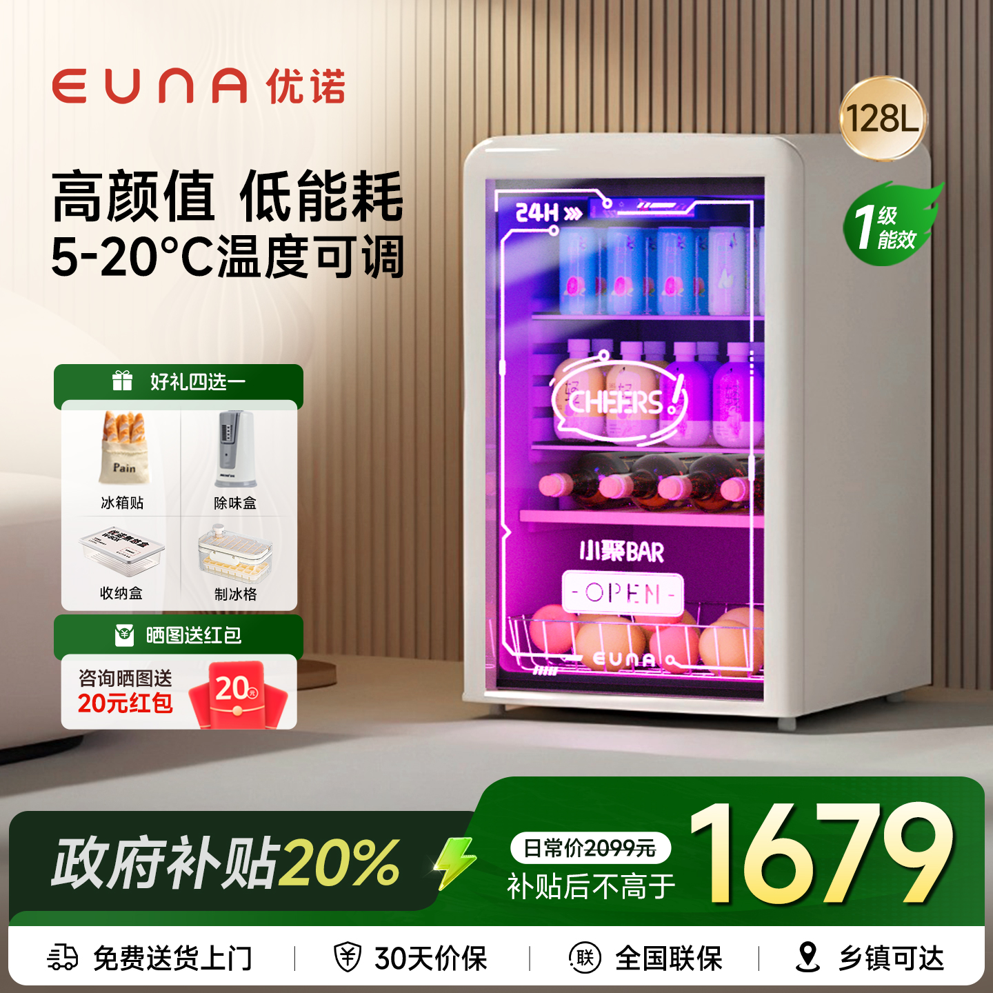 EUNA优诺128L冰吧饮料柜家用复古小冰箱电竞房冷藏茶叶水果保鲜柜