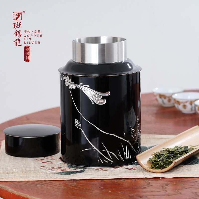 【限量特惠】斑锡龙大漆锡罐手刻清荷茶仓纯锡茶叶罐密封罐储茶