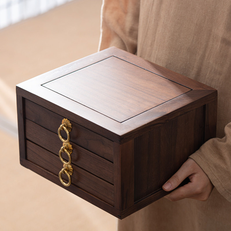 竹制普洱茶盒抽屉式储茶仓茶叶收纳盒多层叠加胡桃木色开 茶分茶