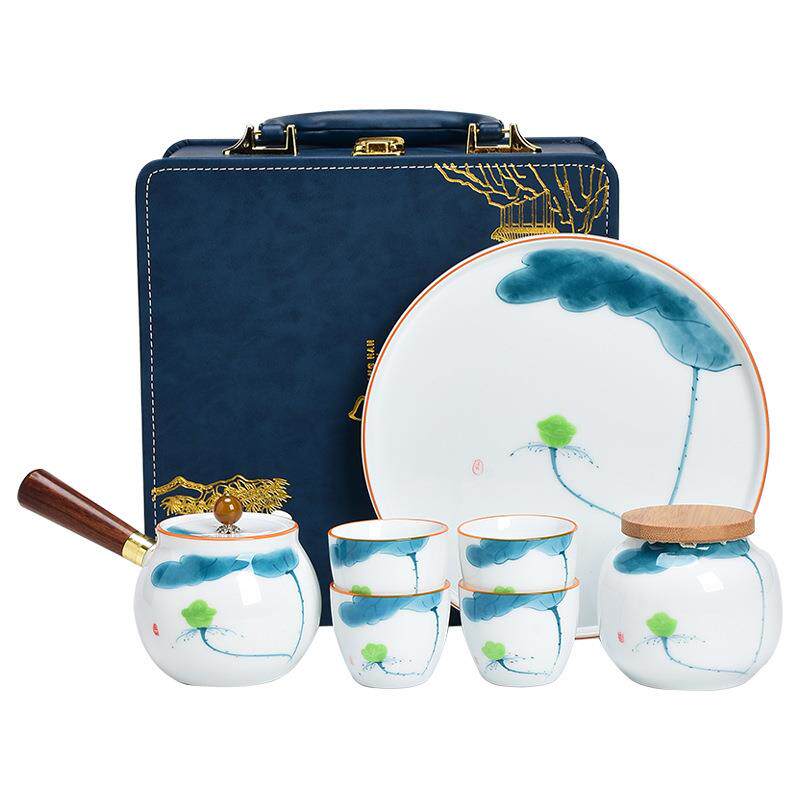 手绘便携式侧把壶旅行茶具套装功夫茶具一壶四杯带茶叶罐带茶盘