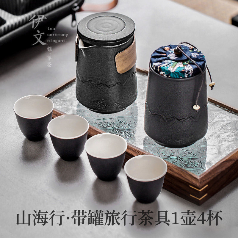 伊文陶瓷旅行茶具套装便携式快客杯一壶四杯带茶叶罐陶瓷过滤茶壶