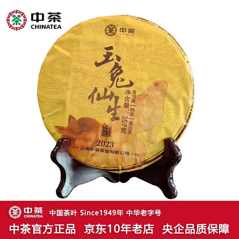 中茶 兔年生肖纪念茶 云南普洱茶叶 2023年玉兔仙生普洱茶饼 熟茶单饼装 357克 * 1饼