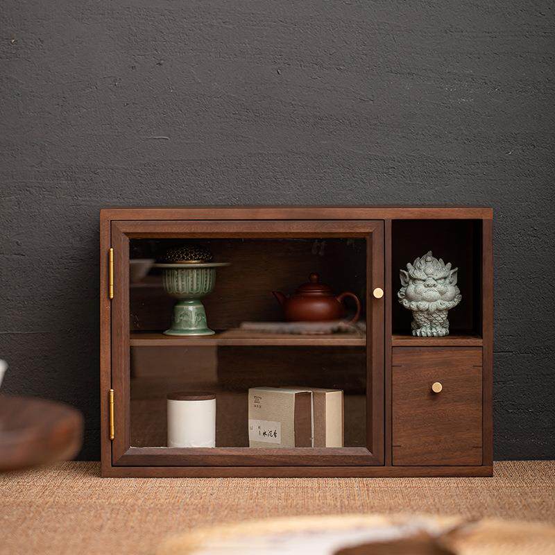 胡桃木桌面小型收纳柜储物柜实木家用茶室茶具茶叶罐防尘柜置物柜