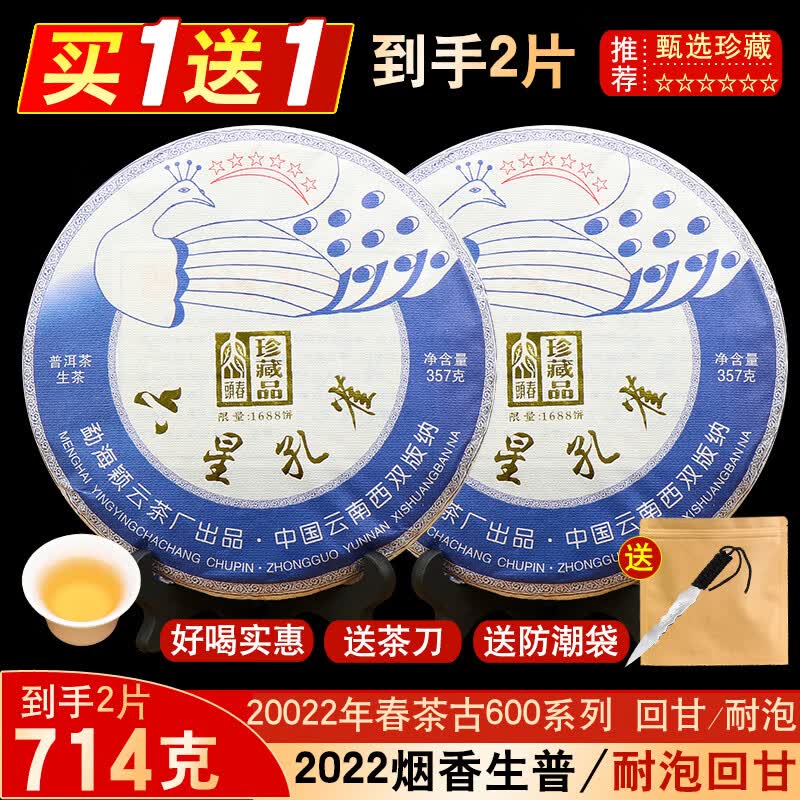 昱琛整箱20片2022年六星孔雀班章普洱茶生茶烟香云南七子饼古树茶茶叶 单片+送1片(到手2片)