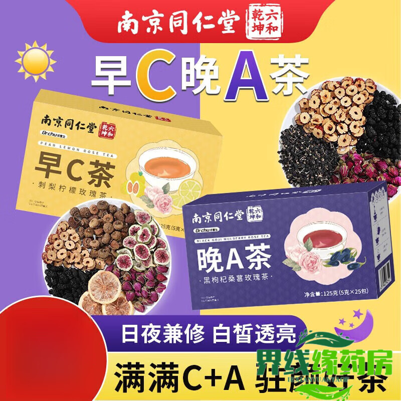 南京同仁堂黑枸杞桑葚玫瑰花茶 养颜刺梨洛神花茶美丽白皙早c晚a茶组合茶包 早C茶*1+晚A茶*1组合2盒搭档装