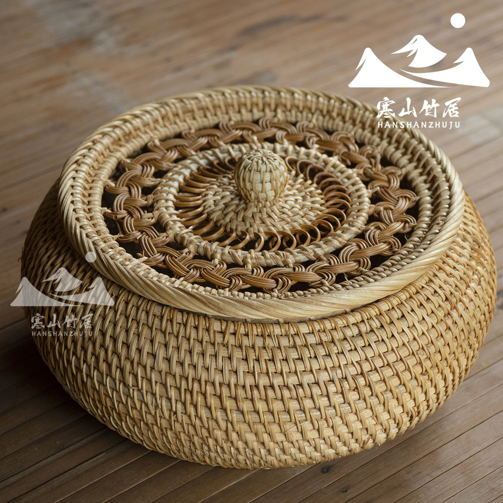 邱师傅竹木藤编茶室茶叶镂空收纳盒圆形零食干果储存收纳盒储物盒