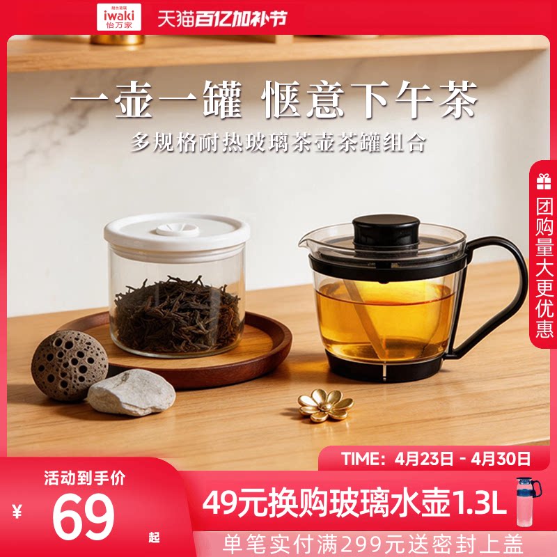 日本iwaki怡万家耐热玻璃茶壶可微波加热带密封茶叶罐