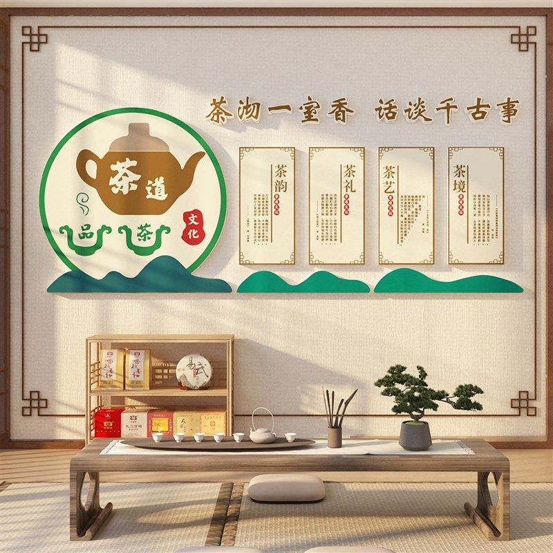 茶室背景墙装饰品布置茶叶店文化茶桌台贴纸画图茶馆庄楼空间创意