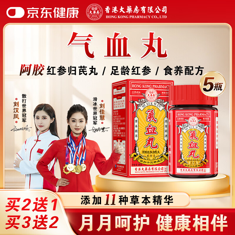 香港大药房有限公司气血丸氣血丸气血女人宝贝阿胶红参归芪丸营养改善成人女性正品 16g*5瓶 【周期装】买3送2