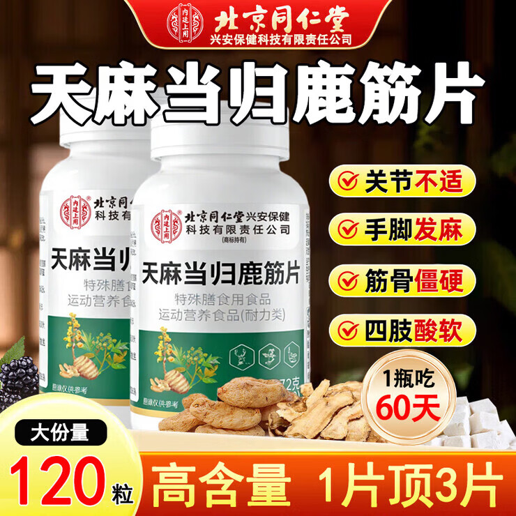 同仁堂天麻当归鹿筋片官方中老年关节不适护软骨关节手脚麻木 【6个月量疗程装】 120片 120片*3瓶