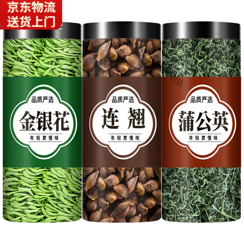 南京同仁堂金银花连翘蒲公英中药材茶包正品老莲翅莲翘双花泡水的功效与作用 金银花25g连翘50g蒲公英50g 3瓶*1罐