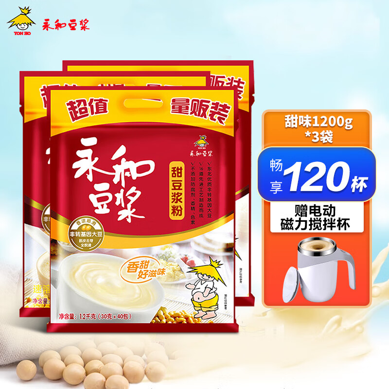 永和豆浆【礼盒】原磨豆浆1200g经典原味冲泡豆浆粉营养早餐运动补充豆粉 1.2kg*3袋甜味【电动搅拌杯】