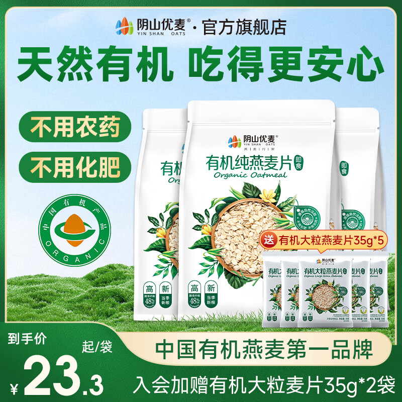 阴山优麦有机纯燕麦片内蒙裸燕麦即食麦片630g独立小袋营养早餐代餐懒人即 【送有机大粒35g*5】630g*3袋
