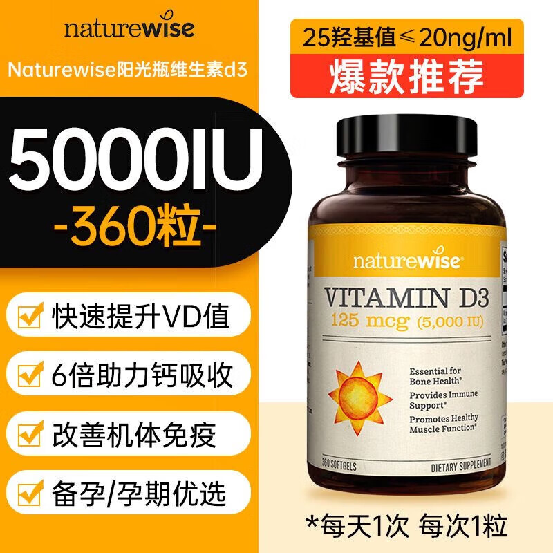 阳光瓶5000iu单位活性维生素d3成人软胶囊25羟基VD备孕妇男女补钙 效期27年香港免税5000IU*360粒防